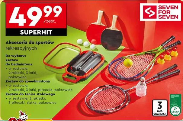 Cena produktu r贸偶ni si臋 w zale偶no艣ci od wybranego sklepu. Produkt Zestaw do badmintona Seven for 7 mo偶esz kupi膰 w promocji ju偶 od 12,99 z艂 do 24,99 z艂. Najta艅sza oferta, jak膮 mamy w naszej bazie jest z sieci Biedronka. Zestaw do badmintona Seven for 7 kosztuje aktualnie 12,99 z艂. Zobacz ofert臋
