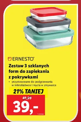 Cena produktu r贸偶ni si臋 w zale偶no艣ci od wybranego sklepu. Niestety nie posiadamy danych o aktualnych promocjach, jednak w艣r贸d archiwalnych ofert Zestaw form do zapiekania 500 ml + 1 l + 1.7 l Ernesto kosztuje od 39 z艂 do 49,99 z艂.