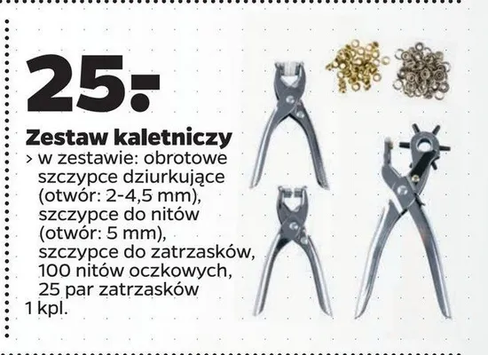 Nie wiesz gdzie kupi膰 produkt Zestaw kaletniczy w promocji? Aktualnie produkt Zestaw kaletniczy znajduje si臋 w atrakcyjnej cenie w sklepach Castorama. Opr贸cz tego produkt mo偶na kupi膰 w innych sklepach, jednak aktulanie nie posiadamy informacji o promocjach w nich.