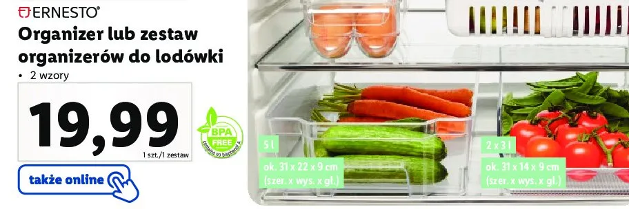 Cena produktu r贸偶ni si臋 w zale偶no艣ci od wybranego sklepu. Niestety nie posiadamy danych o aktualnych promocjach, jednak w艣r贸d archiwalnych ofert Zestaw organizer贸w do lod贸wki Ernesto kosztuje od 19,99 z艂.