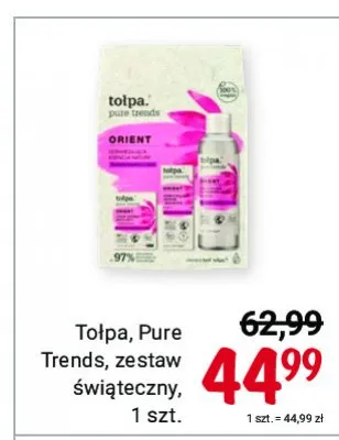 Cena produktu różni się w zależności od wybranego sklepu. Niestety nie posiadamy danych o aktualnych promocjach, jednak wśród archiwalnych ofert Zestaw orient: krem 50 ml + serum 20 ml + żel-olejek 200 ml Tołpa pure trends kosztuje od 44,99 zł.