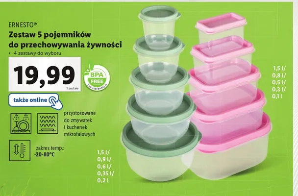 Cena produktu r贸偶ni si臋 w zale偶no艣ci od wybranego sklepu. Niestety nie posiadamy danych o aktualnych promocjach, jednak w艣r贸d archiwalnych ofert Zestaw pojemnik贸w do przechowywania zywno艣ci: 1.5 l + 0.9 l + 0.6 l + 0.35 l + 0.2 l Ernesto kosztuje od 19,99 z艂.