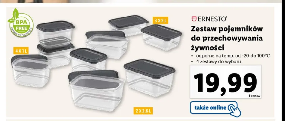 Cena produktu różni się w zależności od wybranego sklepu. Niestety nie posiadamy danych o aktualnych promocjach, jednak wśród archiwalnych ofert Zestaw pojemników na żywność 4 x 1 l Ernesto kosztuje od 9,99 zł do 19,99 zł.