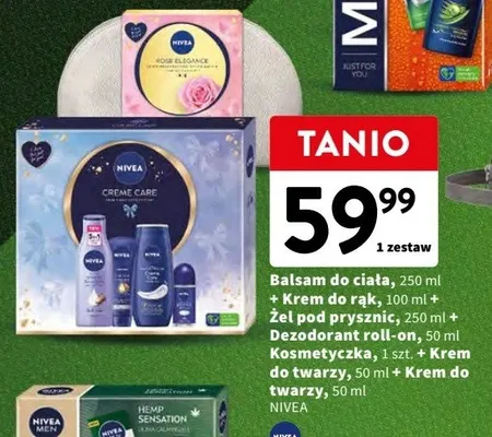 Cena produktu różni się w zależności od wybranego sklepu. Niestety nie posiadamy danych o aktualnych promocjach, jednak wśród archiwalnych ofert Zestaw w pudełku creme care: mleczko do ciała 250 ml + żel pod prysznic 250 ml + krem do rąk 100 ml + dezodorant 50 ml Nivea zestaw kosztuje od 59,99 zł do 69,99 zł.