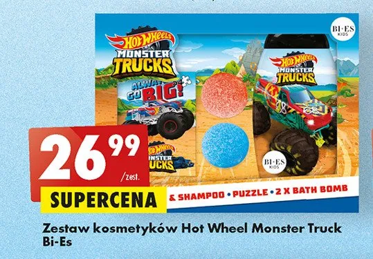 Gdzie można tanio kupić produkt Zestaw w pudełku hot wheels monster trucks: żel+ szampon + puzzle + 2x kule do kąpieli Bi-es hot wheels?