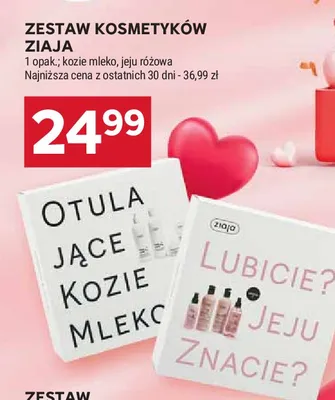 Cena produktu różni się w zależności od wybranego sklepu. Niestety nie posiadamy danych o aktualnych promocjach, jednak wśród archiwalnych ofert Zestaw w pudełku jeju różowy: mydło pod prysznic 300 ml + szampon do włosów 300 ml + mgiełka do twarzy i ciała 200 ml + odżywka do włosów 125 ml Ziaja zestaw kosztuje od 24,99 zł do 29,99 zł.