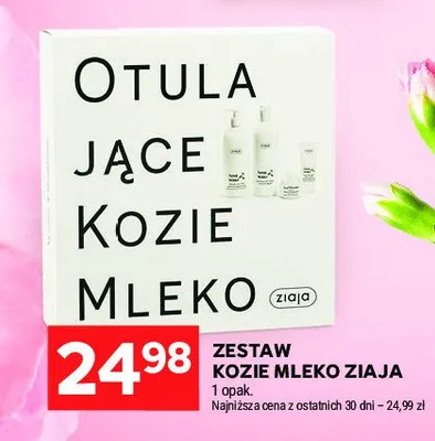 Cena produktu różni się w zależności od wybranego sklepu. Niestety nie posiadamy danych o aktualnych promocjach, jednak wśród archiwalnych ofert Zestaw w pudełku kozie mleko: kremowy żel pod prysznic 500 ml + mleczko do skóry normalnej i suchej 500 ml + krem wygładzający 50 ml + krem do rąk 50 ml Ziaja zestaw kosztuje od 24,98 zł do 34,99 zł.