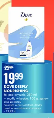 Cena produktu różni się w zależności od wybranego sklepu. Niestety nie posiadamy danych o aktualnych promocjach, jednak wśród archiwalnych ofert Zestaw w pudełku original care żel pod prysznic 250 ml + mydło w kostce 90 g Dove zestaw kosztuje od 19,99 zł.