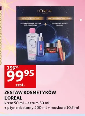 Cena produktu różni się w zależności od wybranego sklepu. Niestety nie posiadamy danych o aktualnych promocjach, jednak wśród archiwalnych ofert Zestaw w pudełku: płyn micelarny skin expert 200 ml + krem do twarzy na dzień revitaliftl filler 50 ml + serum do twarzy revitalift filler 30 ml + tusz do rzęs volume million lashes excess 9 ml L'oreal zestawy kosztuje od 119,99 zł.