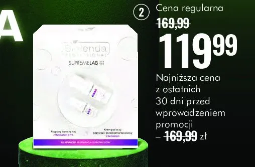 Zastanawiasz si臋, gdzie kupi膰 i ile kosztuje produkt Zestaw w pude艂ku supremelab re-advanced: krem do twarzy na noc 50ml + krem pod oczy 15ml Bielenda zestaw? Regularnie sprawdzamy, czy jest promocja na ten produkt w Biedronka, Lidl, Kaufland, Auchan, Netto, Makro i innych sklepach. Aktualnie nie posiadamy ofert promocyjnych na ten produkt.