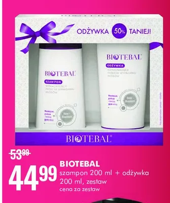 Cena produktu różni się w zależności od wybranego sklepu. Niestety nie posiadamy danych o aktualnych promocjach, jednak wśród archiwalnych ofert Zestaw w pudełku: szampon 200 ml + odżywka 200 ml Biotebal zestaw kosztuje od 44,99 zł do 49,99 zł.