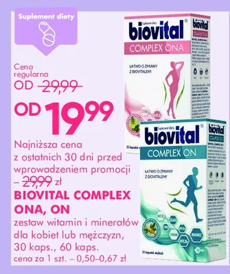 Cena produktu różni się w zależności od wybranego sklepu. Niestety nie posiadamy danych o aktualnych promocjach, jednak wśród archiwalnych ofert Zestaw witamin i minerałów dla mężczyzn Biovital complex on kosztuje od 19,99 zł do 29,99 zł.
