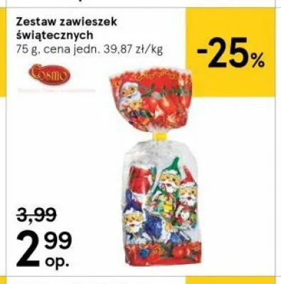Cena produktu r贸偶ni si臋 w zale偶no艣ci od wybranego sklepu. Produkt Zestaw zawieszek czekoladowych Cosmo mo偶esz kupi膰 w promocji ju偶 od 29,99 z艂. Najta艅sza oferta, jak膮 mamy w naszej bazie jest z sieci Kaufland. Zestaw zawieszek czekoladowych Cosmo kosztuje aktualnie 29,99 z艂. Zobacz ofert臋