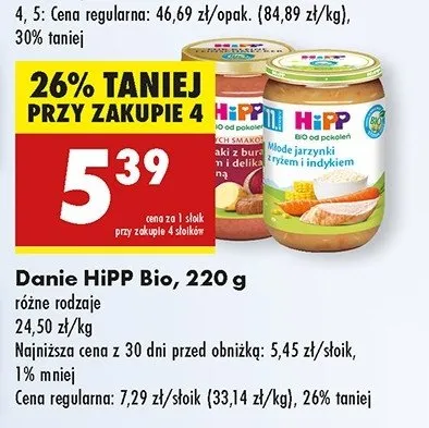 Cena produktu różni się w zależności od wybranego sklepu. Niestety nie posiadamy danych o aktualnych promocjach, jednak wśród archiwalnych ofert Ziemniaki z buraczkami, jabłkiem i delikatną wołowiną Hipp bio kosztuje od 5,37 zł do 5,47 zł.