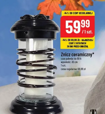 Zastanawiasz si臋, gdzie kupi膰 i ile kosztuje produkt Znicz ceramiczny 30 cm? Regularnie sprawdzamy, czy jest promocja na ten produkt w Biedronka, Lidl, Kaufland, Auchan, Netto, Makro i innych sklepach. Aktualnie nie posiadamy ofert promocyjnych na ten produkt.