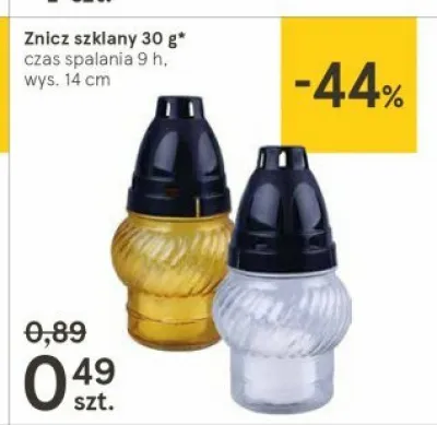 Cena produktu r贸偶ni si臋 w zale偶no艣ci od wybranego sklepu. Niestety nie posiadamy danych o aktualnych promocjach, jednak w艣r贸d archiwalnych ofert Znicz szklany 30 g 14 cm kosztuje od 0,49 z艂.