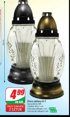 Cena produktu r贸偶ni si臋 w zale偶no艣ci od wybranego sklepu. Niestety nie posiadamy danych o aktualnych promocjach, jednak w艣r贸d archiwalnych ofert Znicz szklany d-7 kosztuje od 4,99 z艂 do 5,49 z艂.