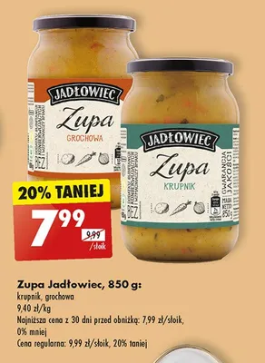 Cena produktu r贸偶ni si臋 w zale偶no艣ci od wybranego sklepu. Niestety nie posiadamy danych o aktualnych promocjach, jednak w艣r贸d archiwalnych ofert Zupa krupnik Jad艂owiec kosztuje od 7,99 z艂.