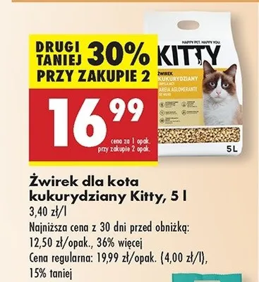 Cena produktu r贸偶ni si臋 w zale偶no艣ci od wybranego sklepu. Niestety nie posiadamy danych o aktualnych promocjach, jednak w艣r贸d archiwalnych ofert 呕wirek kukurydziany Kitty kosztuje od 14,99 z艂 do 16,99 z艂.