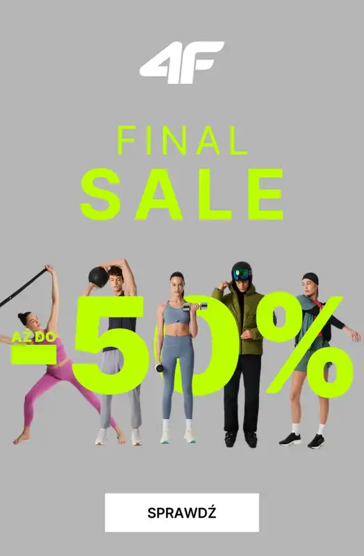 Obejrzyj najnowszą gazetkę sieci 4F, FINAL SALE do -50%, obowiązującą od 23 lutego . Ta aktualna gazetka 4F zawiera wiele wspaniałych promocji na różnego rodzaju produkty.