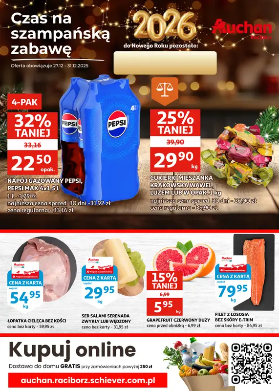 Obejrzyj najnowszą gazetkę sieci Auchan, Gazetka Racibórz I Czas na szampańską zabawę, obowiązującą od 27 grudnia do 31 grudnia. Ta aktualna gazetka Auchan zawiera wiele wspaniałych promocji na różnego rodzaju produkty.