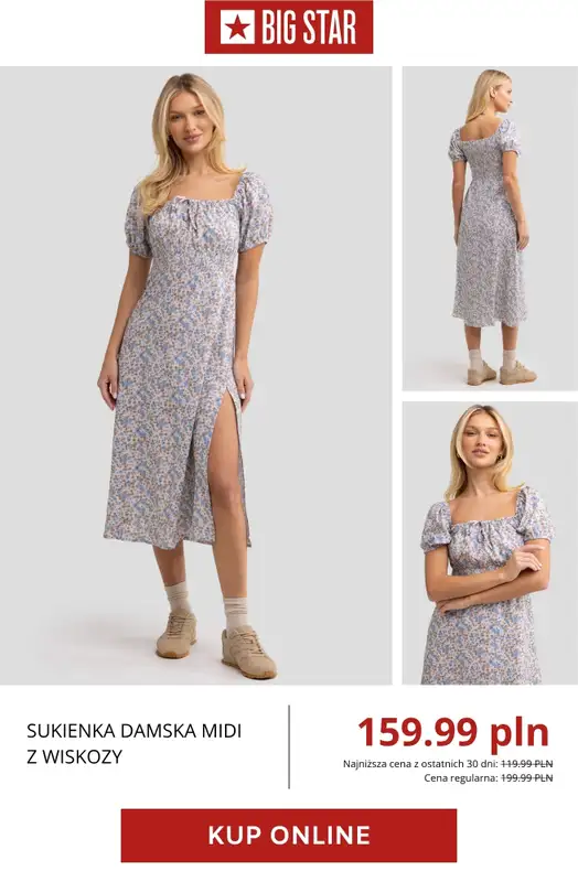 Obejrzyj najnowszą gazetkę sieci BIG STAR, Wyprzedaż: sukienki i spódnice, obowiązującą od 24 kwietnia . Ta aktualna gazetka BIG STAR zawiera wiele wspaniałych promocji na różnego rodzaju produkty.