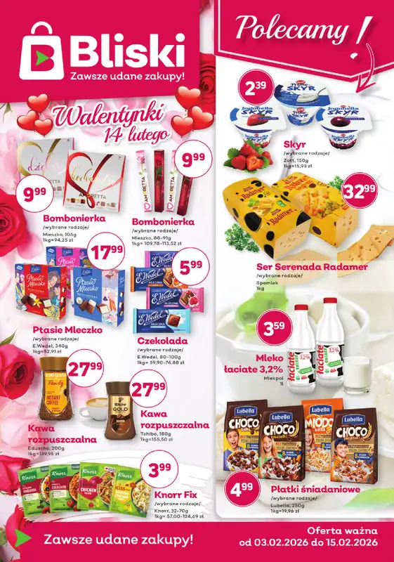 Obejrzyj najnowszą gazetkę sieci Bliski, Gazetka, obowiązującą od 3 lutego do 15 lutego. Ta aktualna gazetka Bliski zawiera wiele wspaniałych promocji na różnego rodzaju produkty.
