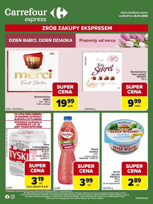 Obejrzyj najnowszą gazetkę sieci Carrefour Express, Gazetka Express, obowiązującą od 20 stycznia do 26 stycznia. Ta aktualna gazetka Carrefour Express zawiera wiele wspaniałych promocji na różnego rodzaju produkty.