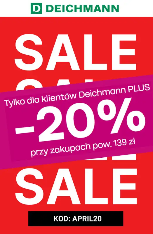 Źródłem informacji na temat promocji, rabatów oraz wyprzedaży na buty i pozostały asortyment sklepu jest najnowsza gazetka Deichmann. Prócz klasycznych obniżek cen znajdziesz tam także najnowszą ofertę sklepu oraz liczne akcje umożliwiające zakup artykułów taniej - np. 3 para gratis czy 50% rabatu przy zakupie drugiego kompletu butów. Większość akcji promocyjnych sieci Deichmann obowiązuje zarówno w sklepie online jak i stacjonarnych placówkach handlowych. Marka przygotowuje także organizowaną kilka razy do roku sezonową wyprzedaż Deichmann na buty i dodatki, w czasie której możesz skorzystać z oferty sklepu Deichmann taniej - kupując zarówno produkty marek własnych sieci, jak i znanych oraz cenionych producentów obuwniczych.