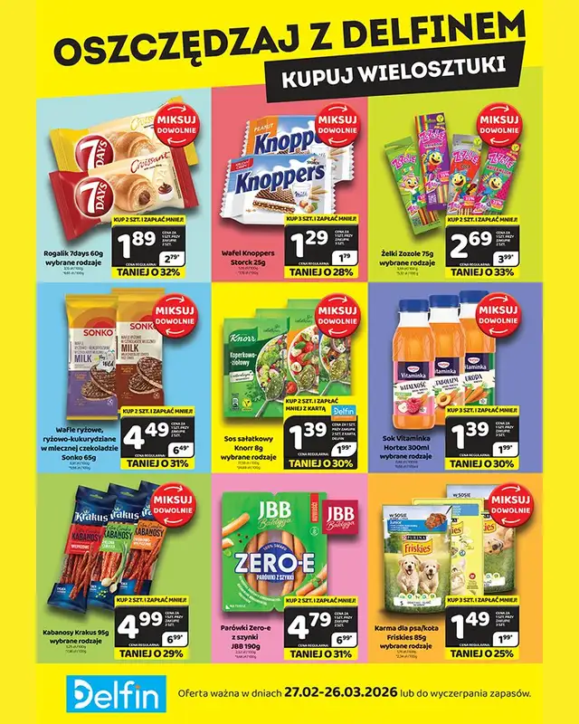 Obejrzyj najnowszą gazetkę sieci Delfin, Oszczędzaj z Delfinem - kupuj wielosztuki, obowiązującą od 27 lutego do 26 marca. Ta aktualna gazetka Delfin zawiera wiele wspaniałych promocji na różnego rodzaju produkty.