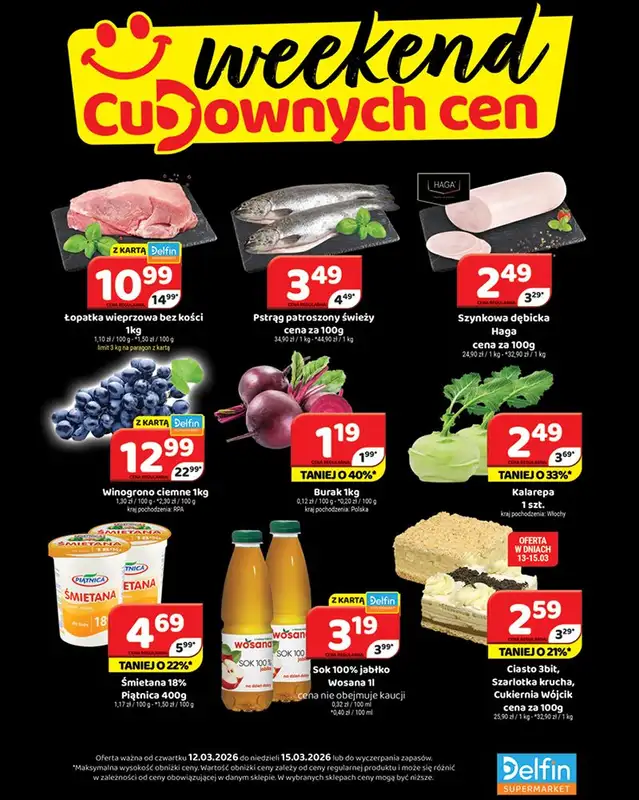 Obejrzyj najnowszą gazetkę sieci Delfin, Weekend cudownych cen, obowiązującą od 12 marca do 15 marca. Ta aktualna gazetka Delfin zawiera wiele wspaniałych promocji na różnego rodzaju produkty.