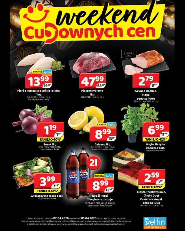 Obejrzyj najnowszą gazetkę sieci Delfin, Weekend cudownych cen, obowiązującą od 2 kwietnia do 5 kwietnia. Ta aktualna gazetka Delfin zawiera wiele wspaniałych promocji na różnego rodzaju produkty.
