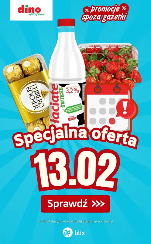 Obejrzyj najnowszą gazetkę sieci Dino, Specjalna oferta na 13.02.2026 - promocje spoza gazetki, obowiązującą od 13 lutego do 13 lutego. Ta aktualna gazetka Dino zawiera wiele wspaniałych promocji na różnego rodzaju produkty.