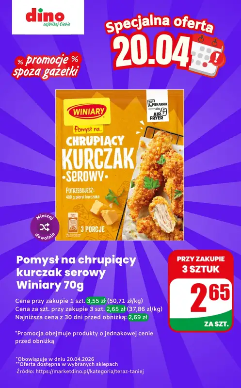 Obejrzyj najnowsz膮 gazetk臋 sieci Dino, Pomys艂 na chrupi膮cy kurczak - oferta na 20.04 | Promocje spoza gazetki, obowi膮zuj膮c膮 od 20 kwietnia do 20 kwietnia. Ta aktualna gazetka Dino zawiera wiele wspania艂ych promocji na r贸偶nego rodzaju produkty.