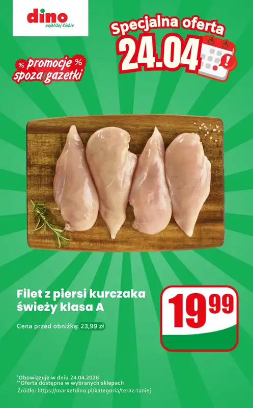 Obejrzyj najnowszą gazetkę sieci Dino, Filet z piersi kurczaka - oferta na 24.04 | Promocje spoza gazetki, obowiązującą od 24 kwietnia do 24 kwietnia. Ta aktualna gazetka Dino zawiera wiele wspaniałych promocji na różnego rodzaju produkty.