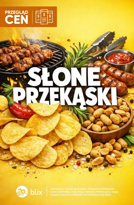 Znajdziesz w niej m.in. oferty na: Orzeszki ziemne smażone solone Bakaliowy Snack za 15,99zł, Chipsy Lay's Thai Sweet Chilli za 9,49zł, Chipsy Lay's camembert z miodem za 9,49zł, Paluszki słone Big Snack za 2,69zł, Paluchy z sezamem Beskidzkie za 2,49zł, Paluszki klasyczne Lajkonik za 4,99zł, Paluszki w polewie Stix Mix Psi Patrol Spin Master za 4,49zł, Popcorn solony Eurosnack za 2,69zł.
