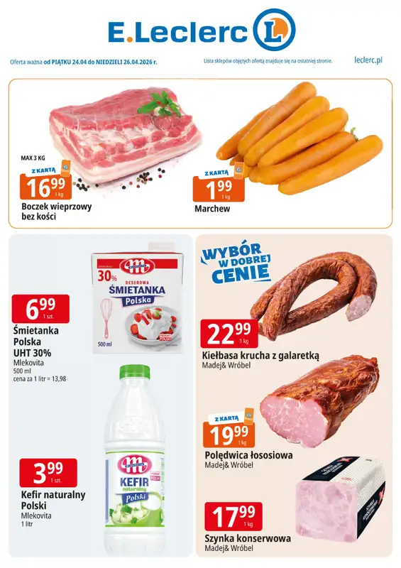 Obejrzyj najnowszą gazetkę sieci Leclerc, Oferta weekendowa, obowiązującą od 24 kwietnia do 26 kwietnia. Ta aktualna gazetka Leclerc zawiera wiele wspaniałych promocji na różnego rodzaju produkty.
