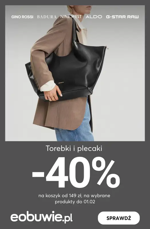 Obejrzyj najnowszą gazetkę sieci eobuwie.pl, Extra -40% na wybrane torebki i plecaki, od 149 zł!, obowiązującą od 12 stycznia do 1 lutego. Ta aktualna gazetka eobuwie.pl zawiera wiele wspaniałych promocji na różnego rodzaju produkty.