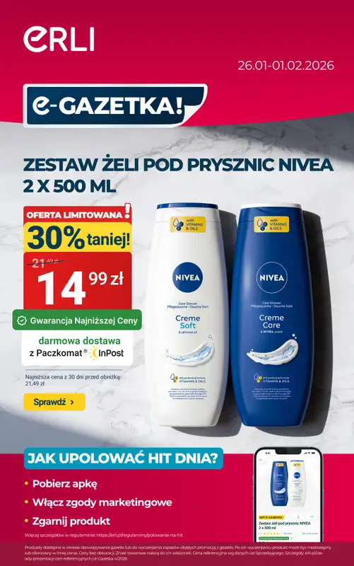 Obejrzyj najnowszą gazetkę sieci ERLI, CODZIENNE ZAKUPY - najtaniej na Erli!, obowiązującą od 26 stycznia do 1 lutego. Ta aktualna gazetka ERLI zawiera wiele wspaniałych promocji na różnego rodzaju produkty.