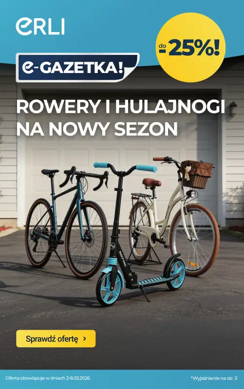 Obejrzyj najnowszą gazetkę sieci ERLI, Katalog Rowery i hulajnogi do -25%!, obowiązującą od 4 marca do 8 marca. Ta aktualna gazetka ERLI zawiera wiele wspaniałych promocji na różnego rodzaju produkty.