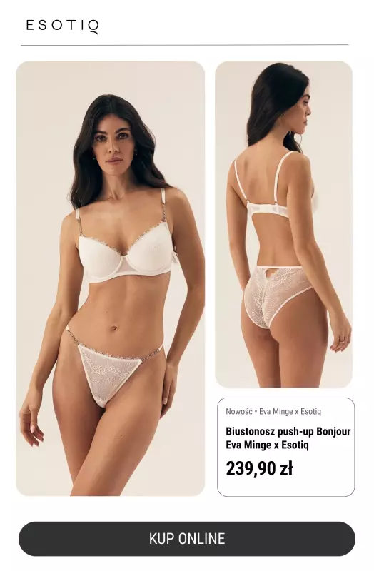 Esotiq to uznana marka bielizny, od lat obecna na polskim rynku. Sklepy Esotiq oferują szeroki wybór biustonoszy, majtek, odzieży domowej i dodatków, które łączą styl z wygodą, odpowiadając na potrzeby współczesnych kobiet. Dzięki gazetkom promocyjnym Esotiq klienci mogą regularnie korzystać z atrakcyjnych ofert, które są dostępne zarówno w salonach stacjonarnych, jak i online.