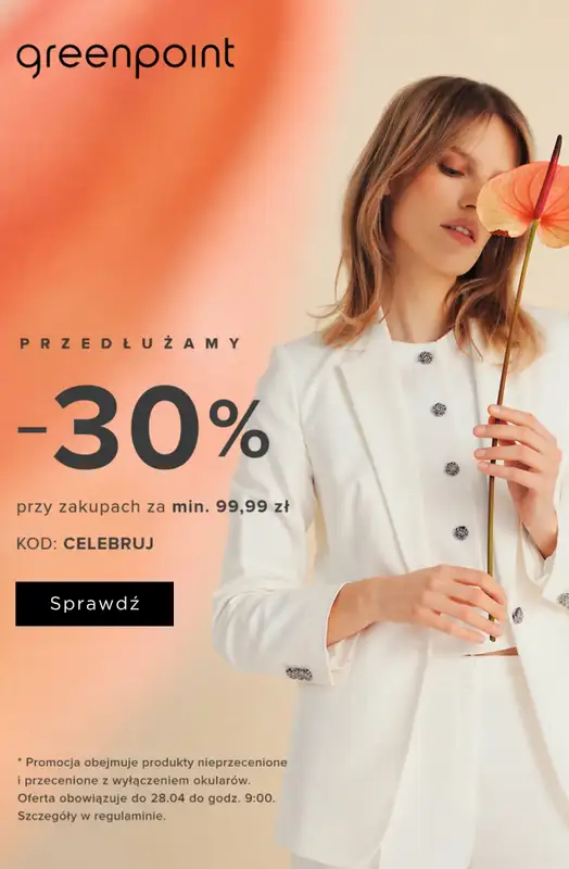 Obejrzyj najnowszą gazetkę sieci Greenpoint, Dodatkowe -30% przy zakupach za min. 99,99 zł, obowiązującą od 22 kwietnia do 28 kwietnia. Ta aktualna gazetka Greenpoint zawiera wiele wspaniałych promocji na różnego rodzaju produkty.