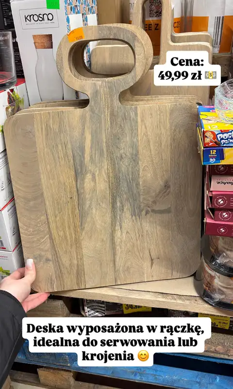 Znajdziesz w niej m.in. oferty na: Deska wyposażona w rączkę za 49,99zł, Sos pomidorowy z malinowymi pomidorami za 10,99zł, Pędy bambusa w wodzie za 7,99zł, Herbata czarna jeżyna & marakuja za 7,99zł, Guziko żelki banan za 4,99zł, Przyprawa do pieczonego łososia air fryer za 2,29zł, Szampon, żel i płyn do kąpieli o zapachu borówki 3w1 za 9,99zł, Owsianka na kokosie z malinami za 6,49zł.
