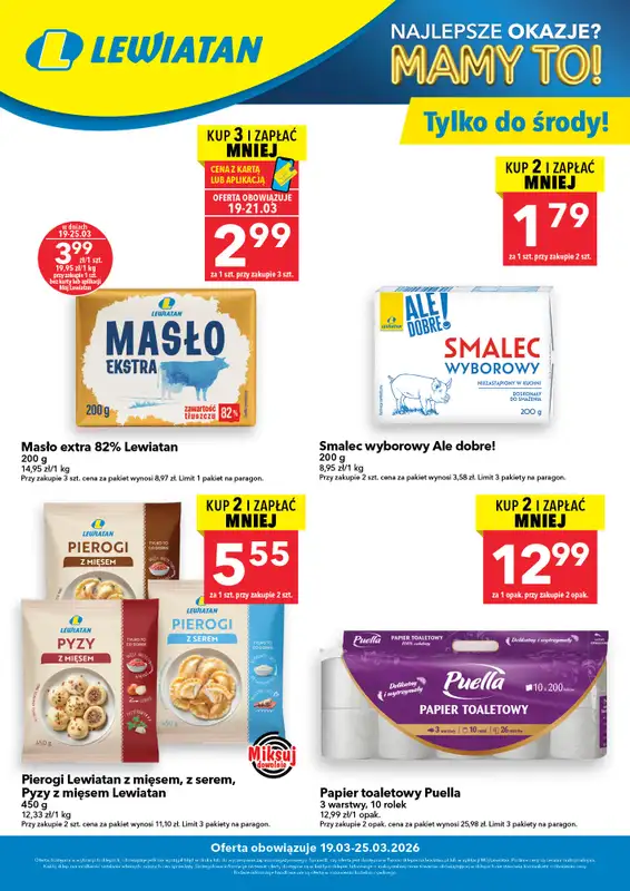 Znajdziesz w niej m.in. oferty na: Papier toaletowy za 12,99zł, Smalec wyborowy za 1,79zł, Pyzy z mięsem za 5,55zł, Masło extra 82% za 2,99zł, Pierogi z serem za 5,55zł, Pierogi z mięsem za 5,55zł.