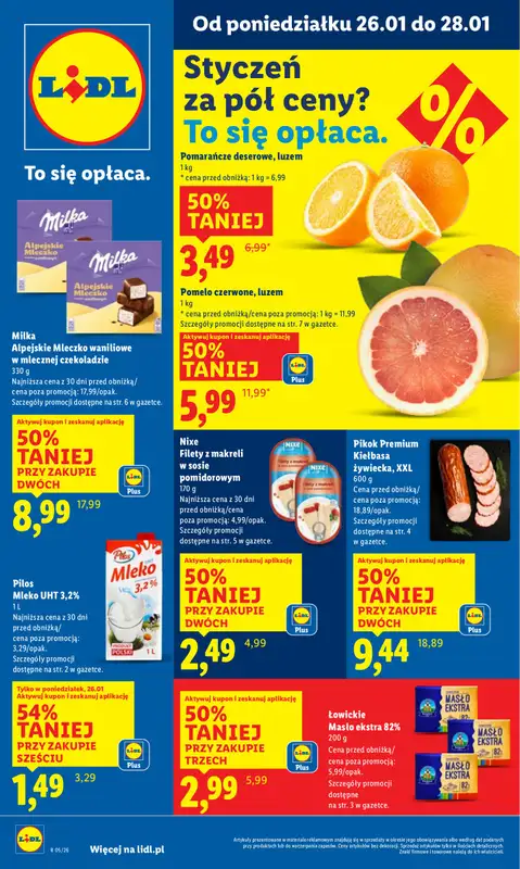 Znajdziesz w niej m.in. oferty na: Kiełbasa żywiecka, XXL za 9,44zł, Filety z makreli w sosie pomidorowym za 2,49zł, Pomelo czerwone, luzem za 5,99zł, Alpejskie Mleczko waniliowe w mlecznej czekoladzie za 8,99zł, Pomarańcze deserowe, luzem za 3,49zł, Masło Łowickie ekstra 82% za 2,99zł, Mleko UHT 3,2% za 1,49zł, Mleko Pilos UHT 3,2% 1L za 1,49zł.