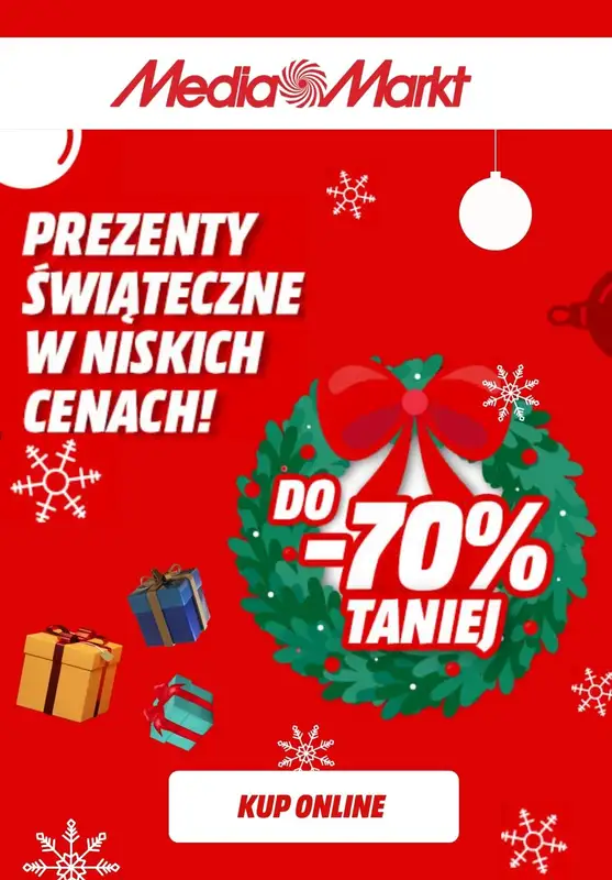Obejrzyj najnowszą gazetkę sieci Media Markt, Do -70% na prezenty świąteczne, obowiązującą od 17 grudnia do 22 grudnia. Ta aktualna gazetka Media Markt zawiera wiele wspaniałych promocji na różnego rodzaju produkty.