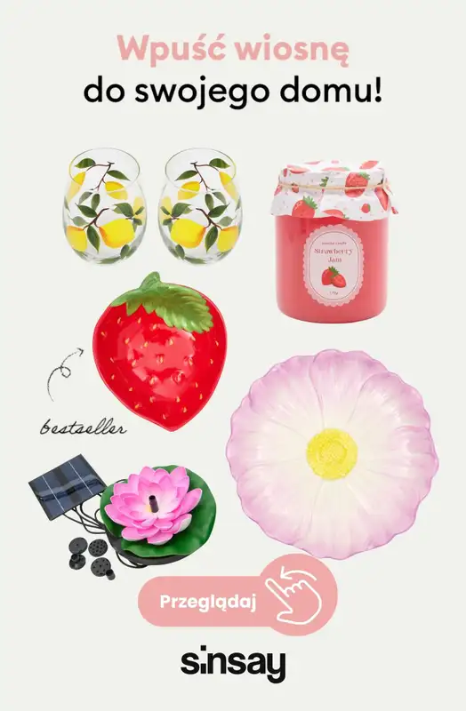 Obejrzyj najnowszą gazetkę sieci Sinsay, Nowości do domu!, obowiązującą od 8 kwietnia do 14 kwietnia. Ta aktualna gazetka Sinsay zawiera wiele wspaniałych promocji na różnego rodzaju produkty.