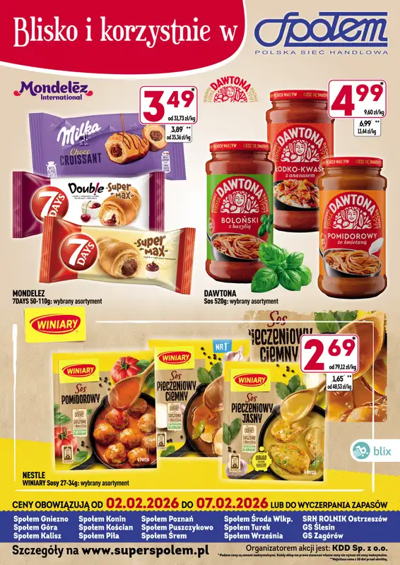 Obejrzyj najnowszą gazetkę sieci Społem - Blisko i Korzystnie, Plakat promocyjny, obowiązującą od 3 lutego do 7 lutego. Ta aktualna gazetka Społem - Blisko i Korzystnie zawiera wiele wspaniałych promocji na różnego rodzaju produkty.