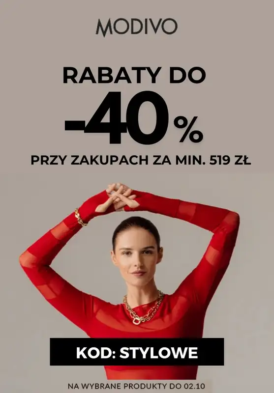Obejrzyj najnowszą gazetkę sieci 2024 STYLOWE ZAKUPY, Modivo | Rabaty do -40% Stylowe Zakupy, obowiązującą od 27 września do 2 października. Ta aktualna gazetka 2024 STYLOWE ZAKUPY zawiera wiele wspaniałych promocji na różnego rodzaju produkty.