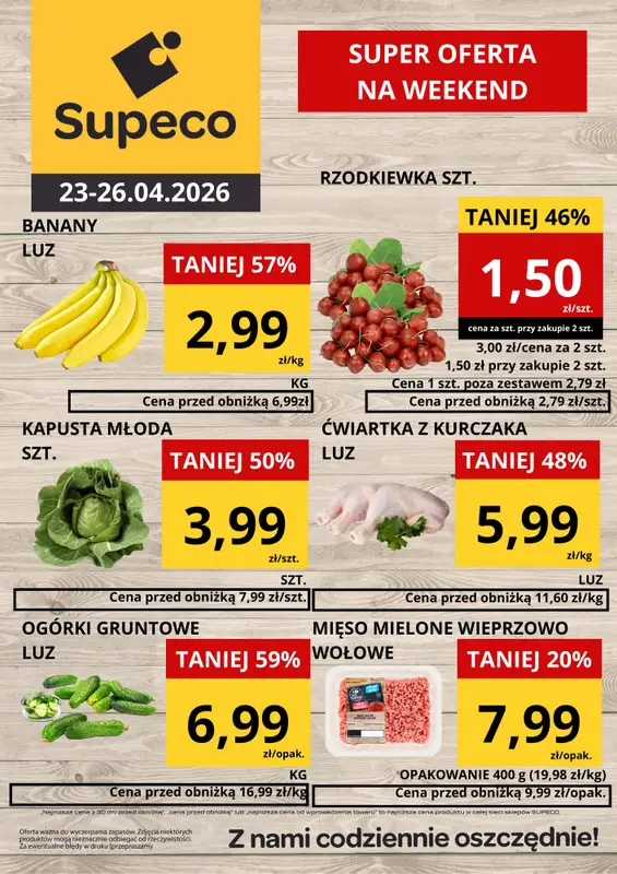 Znajdziesz w niej m.in. oferty na: Rzodkiewka szt. za 1,50zł, Kapusta młoda szt. za 3,99zł, Ogórki gruntowe luz za 6,99zł, Banany luz za 2,99zł, Ćwiartka z kurczaka luz za 5,99zł, Mięso mielone wieprzowo wołowe opakowanie za 7,99zł.